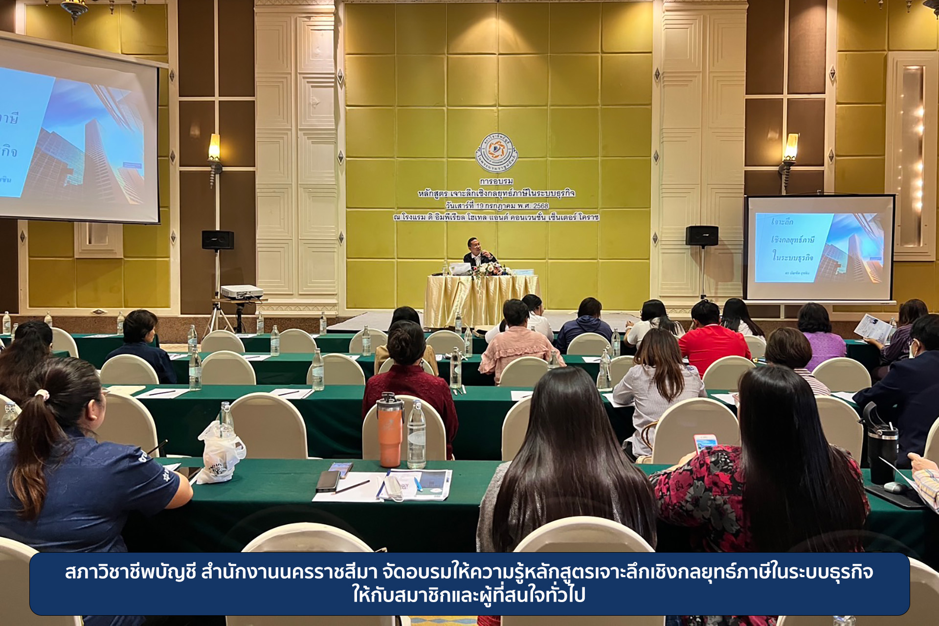 สภาวิชาชีพบัญชี สำนักงานนครราชสีมา จัดอบรมให้ความรู้หลักสูตรเจาะลึกเชิงกลยุทธ์ภาษีในระบบธุรกิจ ให้กับสมาชิกและผู้ที่สนใจทั่วไป วันที่ 19 กรกฎาคม 2568 สภาวิชาชีพบัญชี สำนักงานนครราชสีมา จัดอบรมให้ความรู้หลักสูตรเจาะลึกเชิงกลยุทธ์ภาษีในระบบธุรกิจ ณ โรงแรม ดิ อิมพีเรียล โฮเทล แอนด์คอนเวนชั่น เซ็นเตอร์ โคราช จังหวัดนครราชสีมา โดยทางสภาฯ ได้เชิญ ดร.บัณฑิต อุชชิน นิติกรชำนาญการ สำนักกฎหมาย กรมสรรพกร มาเป็นวิทยากรบรรยาย โดยมีหัวข้อที่สำคัญ ได้แก่ Update กฎหมายใหม่ปี 2568 เทคนิคการคำนวณภาษีเงินได้นิติบุคคล ประเด็นปัญหาที่สรรพากรใช้ประเมินผู้เสียภาษีภาษีมูลค่าเพิ่ม ปัญหาที่ถูกประเมินมากที่สุดในทางปฏิบัติเกี่ยวกับภาษีเงินได้หัก ณ ที่จ่าย เป็นต้น หลักสูตรดังกล่าวเปิดลงทะเบียนให้แก่สมาชิกสภาวิชาชีพบัญชี และผู้ที่สนใจทั่วไป ซึ่งการจัดอบรมในครั้งนี้มีผู้ให้ความสนใจลงทะเบียนเข้าร่วมอบรมในหลักสูตรจำนวนมาก สภาวิชาชีพบัญชีฯ : ข้อมูล/ภาพประกอบ อติโรจน์ วงษ์วัชรศักดิ์: เรียบเรียงข่าว