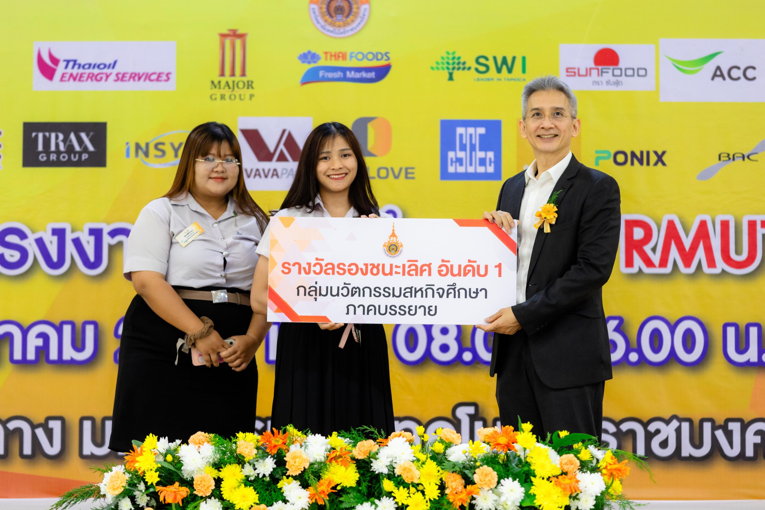 - รางวัลชนะเลิศ ได้แก่ ผลงาน “การประยุกต์ใช้หลักการ ECRS เพื่อเพิ่มประสิทธิภาพในการเตรียมตรวจเช็คชิ้นงานโดยใช้รถเข็นขาตั้ง CMM” โดย นายธนกร พินนิตย์ และนายภูมิ นิงกระโทก นักศึกษาสาขาวิชาการจัดการ-การจัดการอุตสาหกรรม