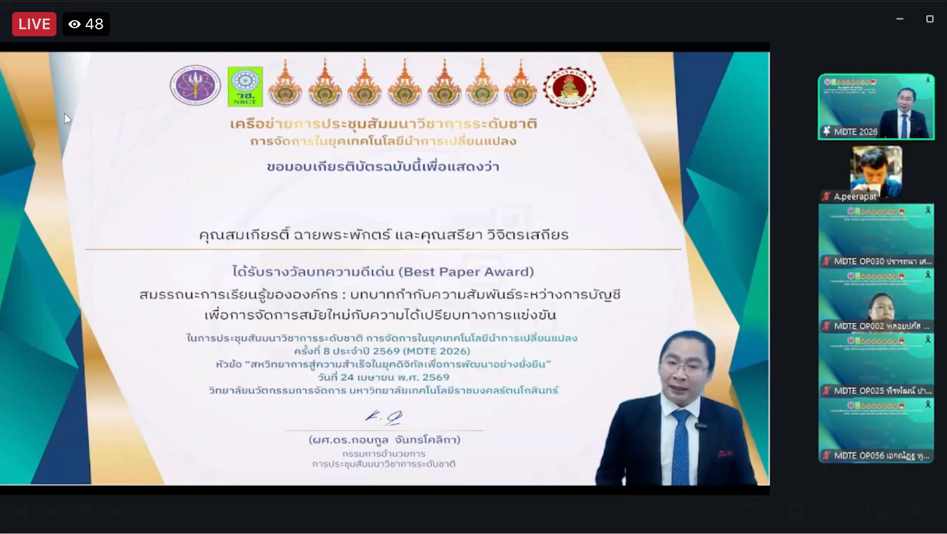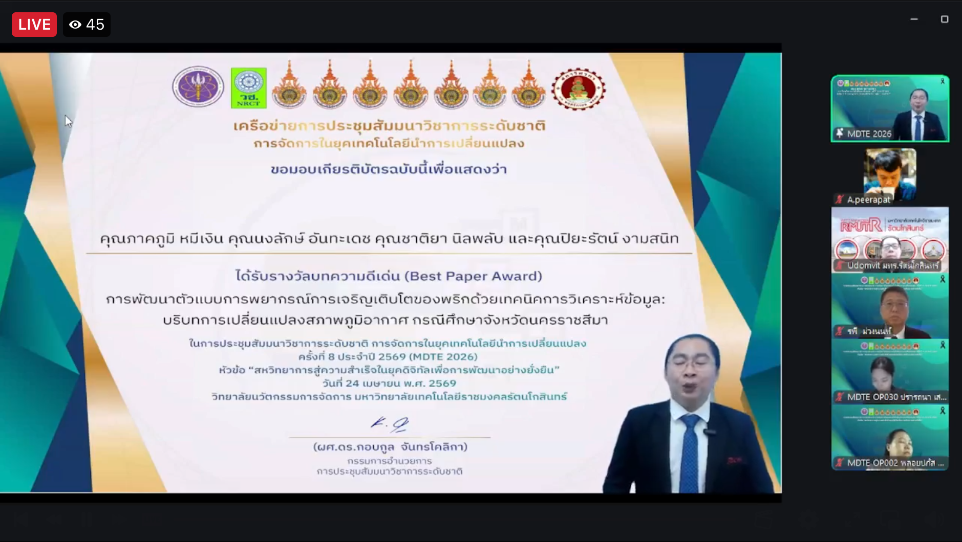 คณะบริหารธุรกิจ มหาวิทยาลัยเทคโนโลยีราชมงคลอีสาน ขอแสดงความยินดีกับคณาจารย์และนักวิจัยที่ได้รับรางวัลผลงานวิจัยดีเด่น (Best Paper Award) ในการประชุมสัมมนาวิชาการระดับชาติ การจัดการในยุคเทคโนโลยีการเปลี่ยนแปลง ครั้งที่ 8 ประจำปี 2569 หัวข้อ (MDTE 2026) หัวข้อ “สหวิทยากรสู่ความสำเร็จในยุคดิจิทัลเพื่อการพัฒนาอย่างยั่งยืน” ซึ่งจัดขึ้นเมื่อวันที่ 24 เมษายน 2569 ณ วิทยาลัยนวัตกรรมการจัดการ มหาวิทยาลัยเทคโนโลยีราชมงคลรัตนโกสินทร์ ผ่านระบบออนไลน์