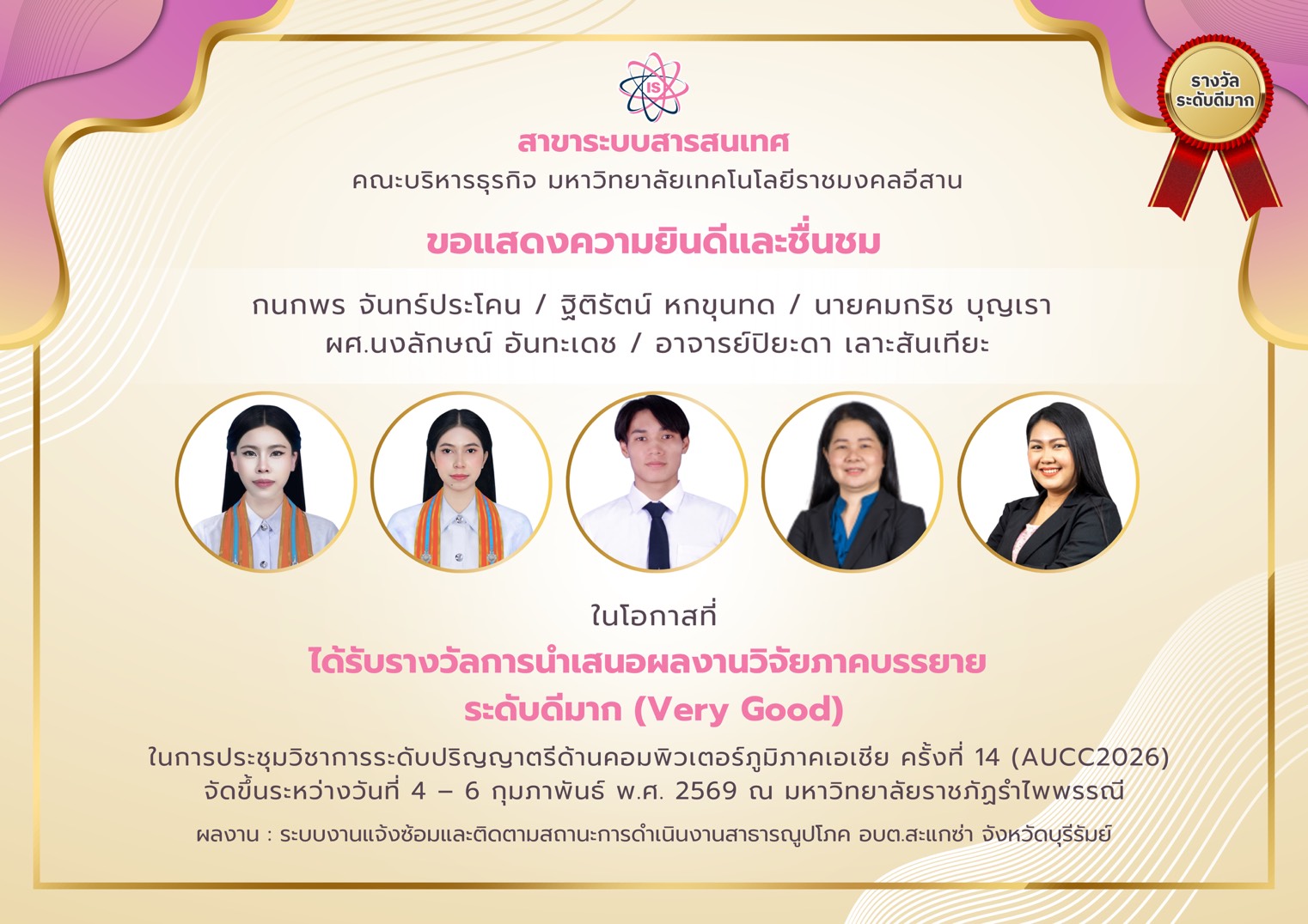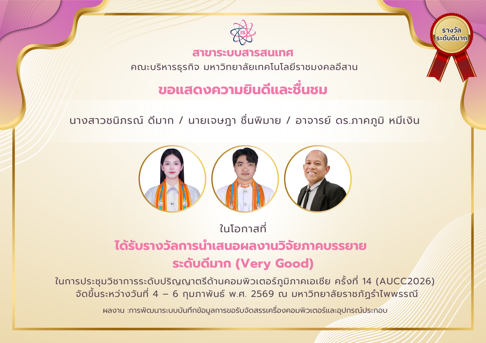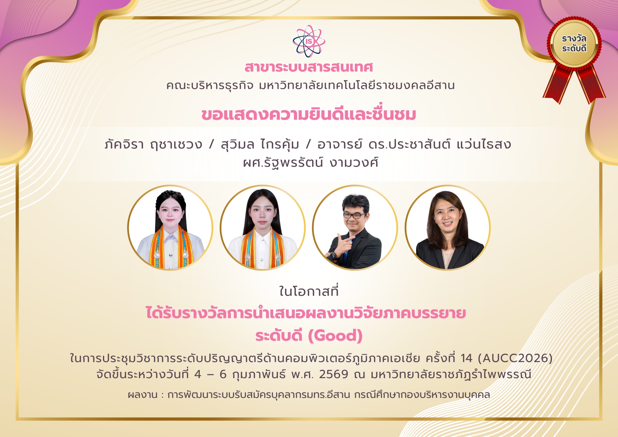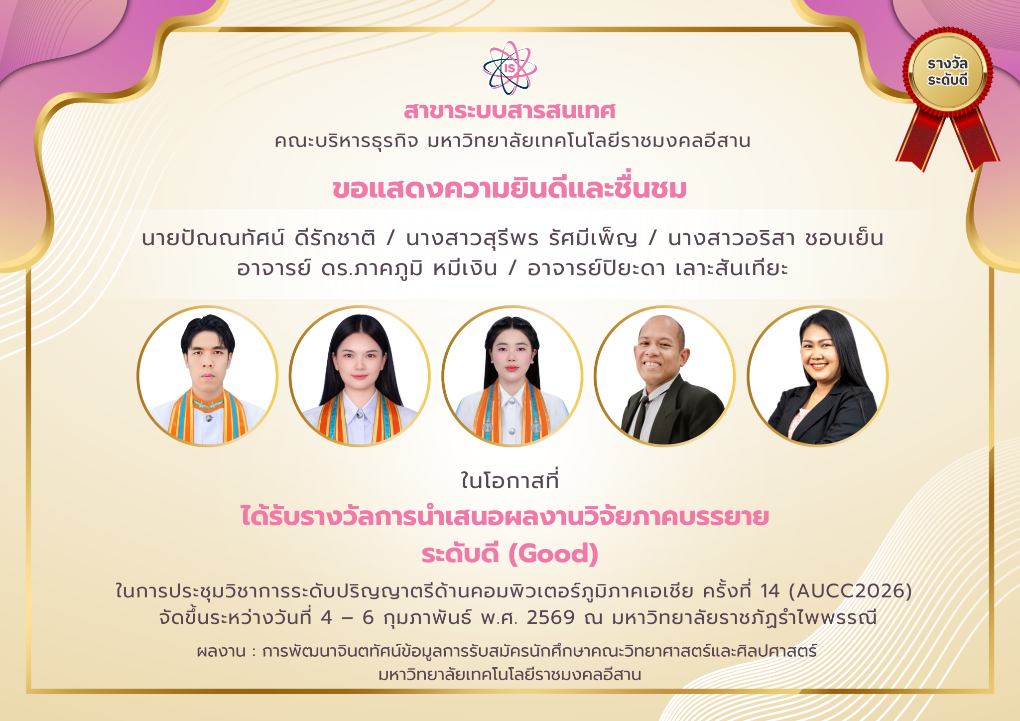 วันที่ 4 – 6 กุมภาพันธ์ 2569 สาขาระบบสารสนเทศ คณะบริหารธุรกิจ มทร.อีสาน เข้าร่วมการประชุมวิชาการระดับปริญญาตรีด้านคอมพิวเตอร์ภูมิภาคเอเชีย ครั้งที่ 14 The 14th Asia Undergraduate Conference on Computing (AUCC2026) ประจำปี 2569 ในรูปแบบออนไลน์ ณ มหาวิทยาลัยราชภัฏรำไพพรรณี จังหวัดจันทบุรี และได้ส่งผลงานในรายวิชาโครงการวิจัยระดับปริญญาตรี และโครงการสหกิจศึกษา เพื่อการนำเสนอจำนวน 29 ผลงาน และสามารถคว้ารางวัลระดับ Excellence จำนวน 2 ผลงาน รางวัลระดับ Very Good จำนวน 14 ผลงาน รางวัลระดับ Good จำนวน 11 ผลงาน และได้รับเกียรติบัตรเข้าร่วมนำเสนอ จำนวน 2 ผลงาน