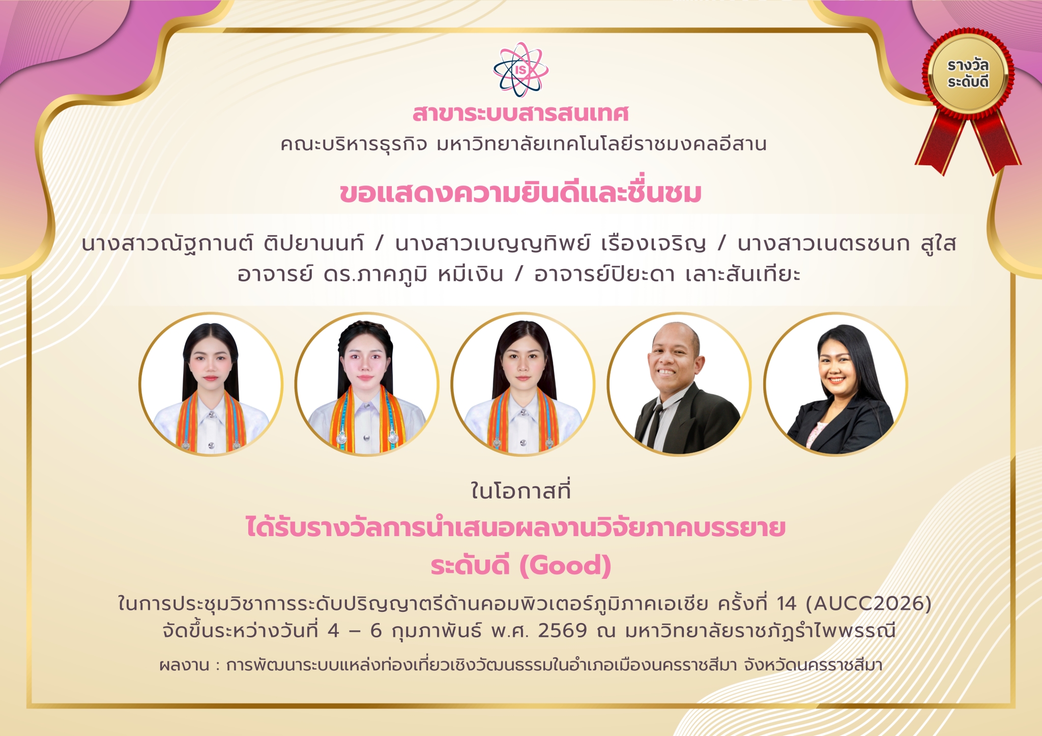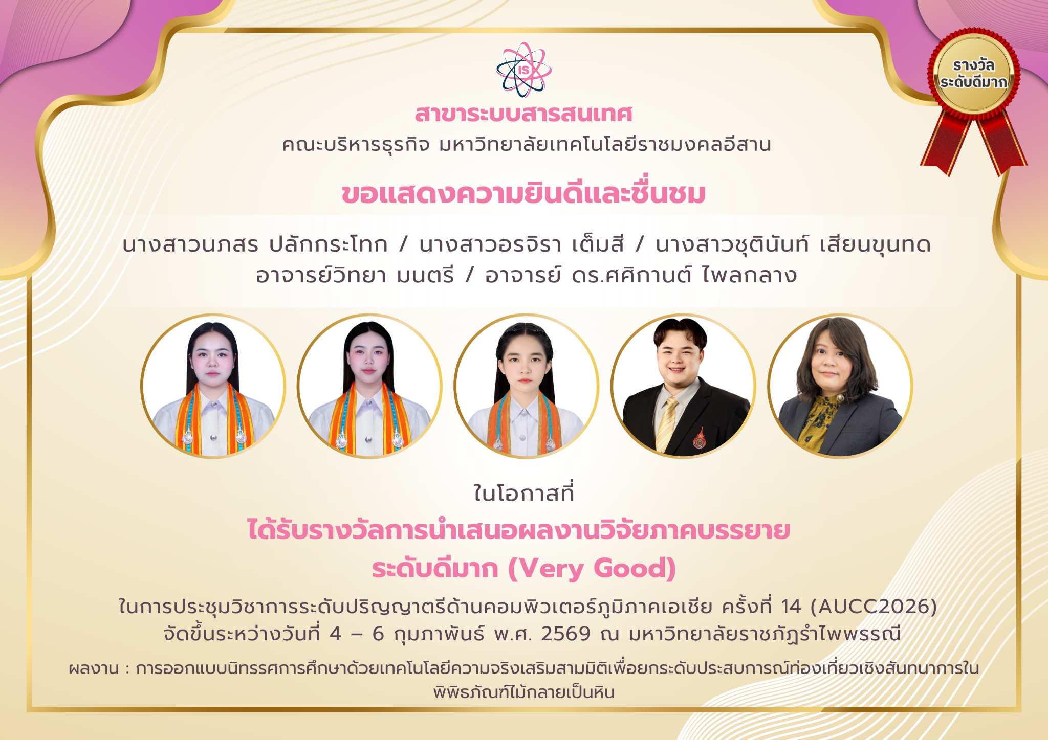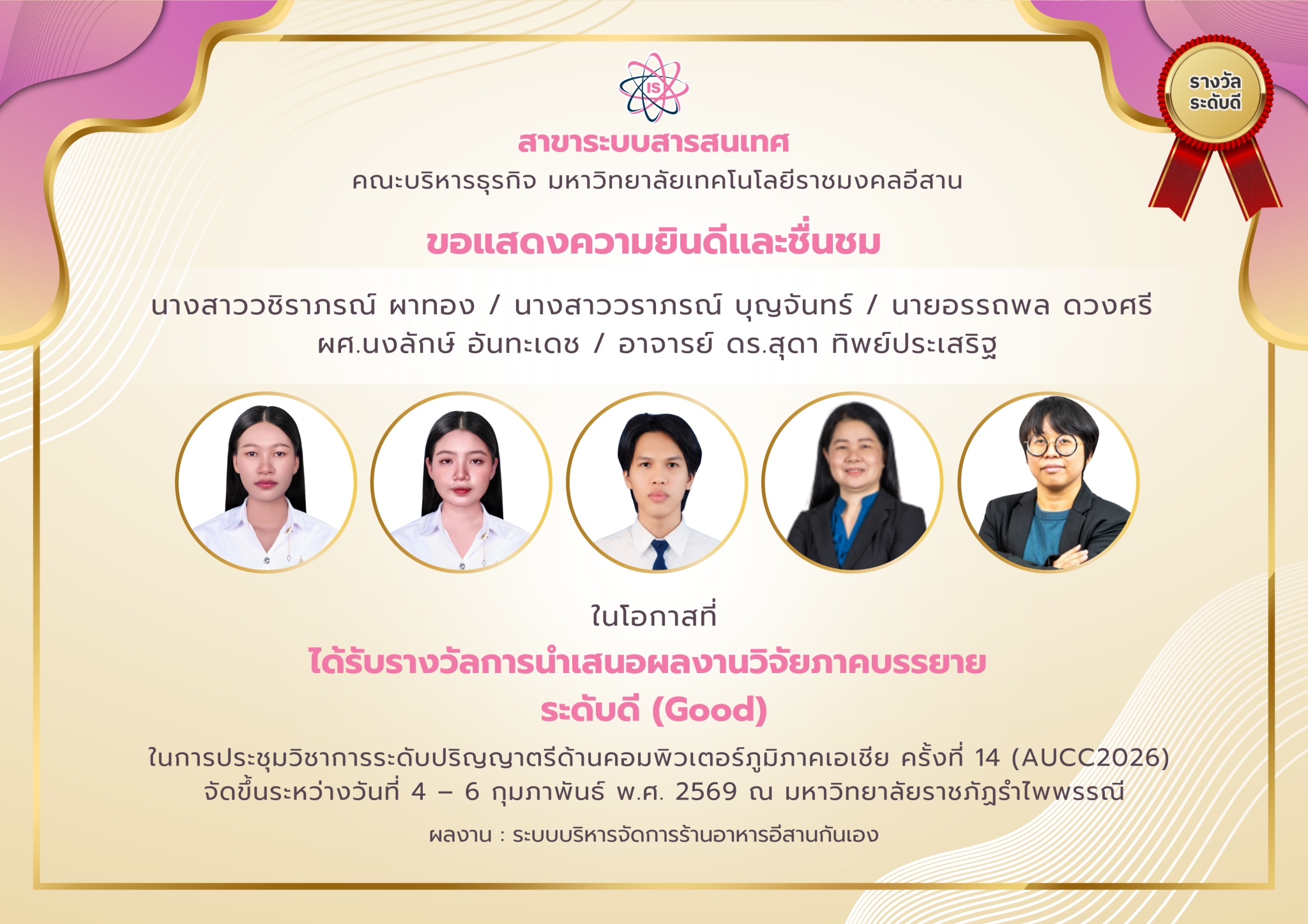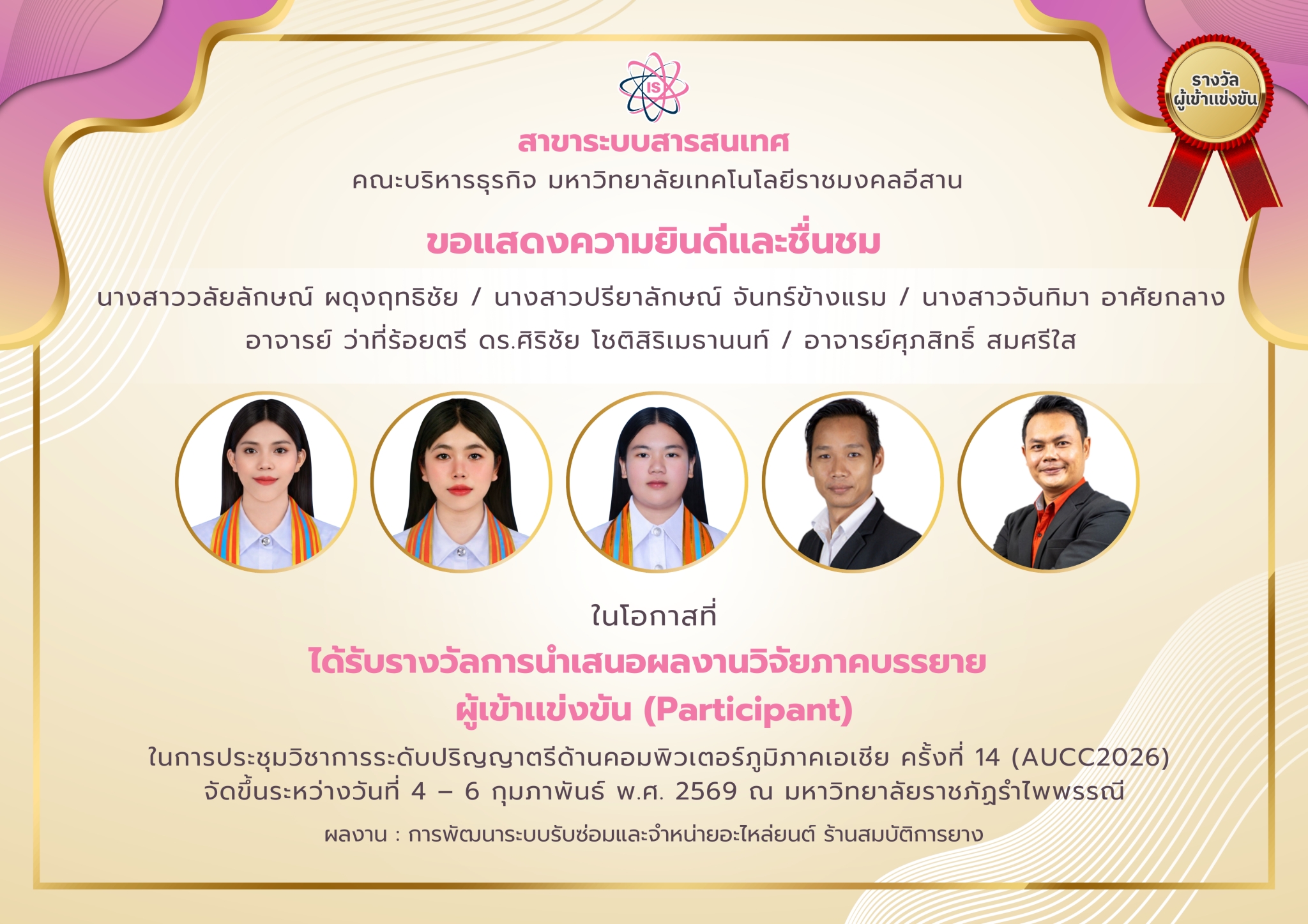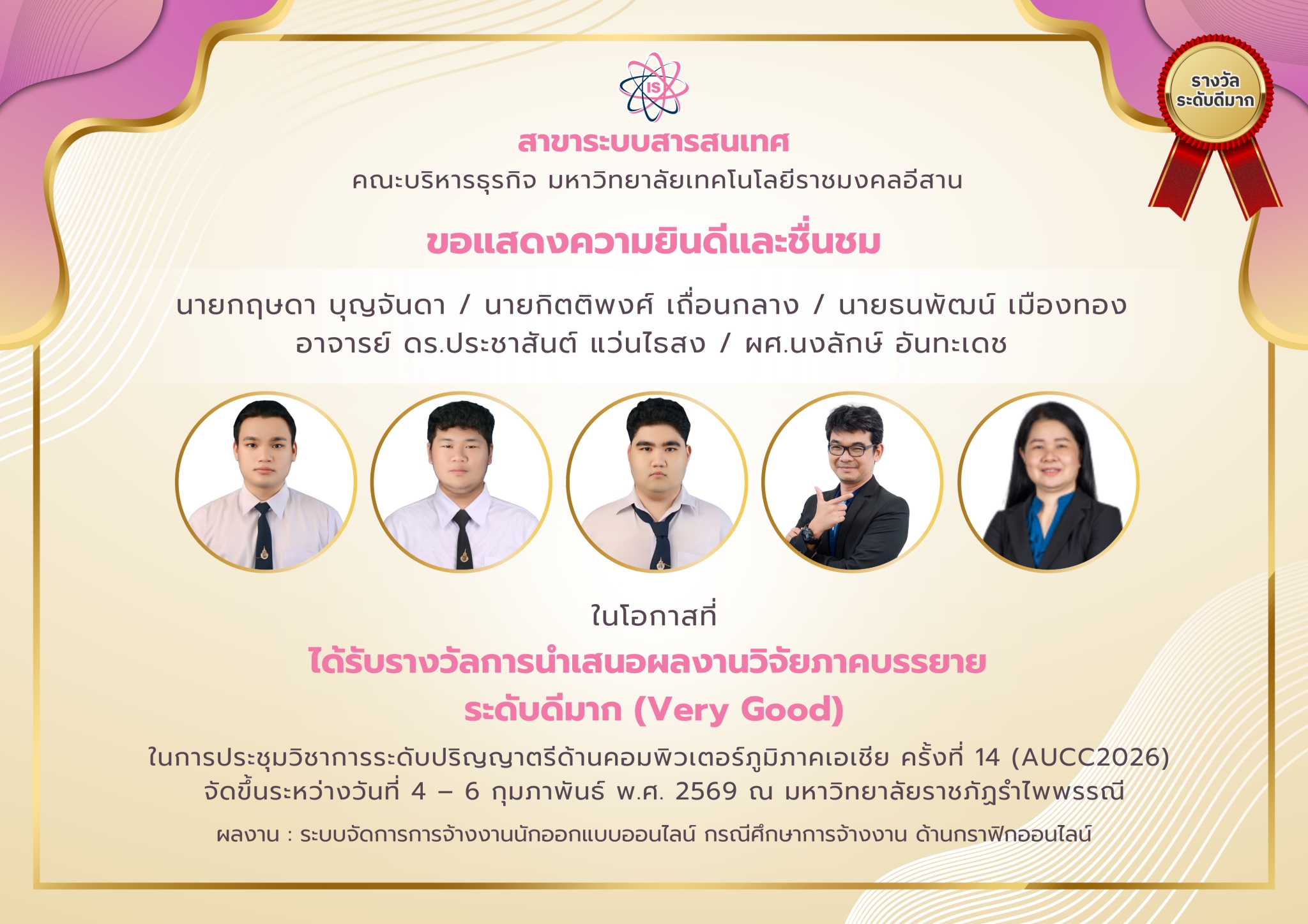 วันที่ 4 – 6 กุมภาพันธ์ 2569 สาขาระบบสารสนเทศ คณะบริหารธุรกิจ มทร.อีสาน เข้าร่วมการประชุมวิชาการระดับปริญญาตรีด้านคอมพิวเตอร์ภูมิภาคเอเชีย ครั้งที่ 14 The 14th Asia Undergraduate Conference on Computing (AUCC2026) ประจำปี 2569 ในรูปแบบออนไลน์ ณ มหาวิทยาลัยราชภัฏรำไพพรรณี จังหวัดจันทบุรี และได้ส่งผลงานในรายวิชาโครงการวิจัยระดับปริญญาตรี และโครงการสหกิจศึกษา เพื่อการนำเสนอจำนวน 29 ผลงาน และสามารถคว้ารางวัลระดับ Excellence จำนวน 2 ผลงาน รางวัลระดับ Very Good จำนวน 14 ผลงาน รางวัลระดับ Good จำนวน 11 ผลงาน และได้รับเกียรติบัตรเข้าร่วมนำเสนอ จำนวน 2 ผลงาน