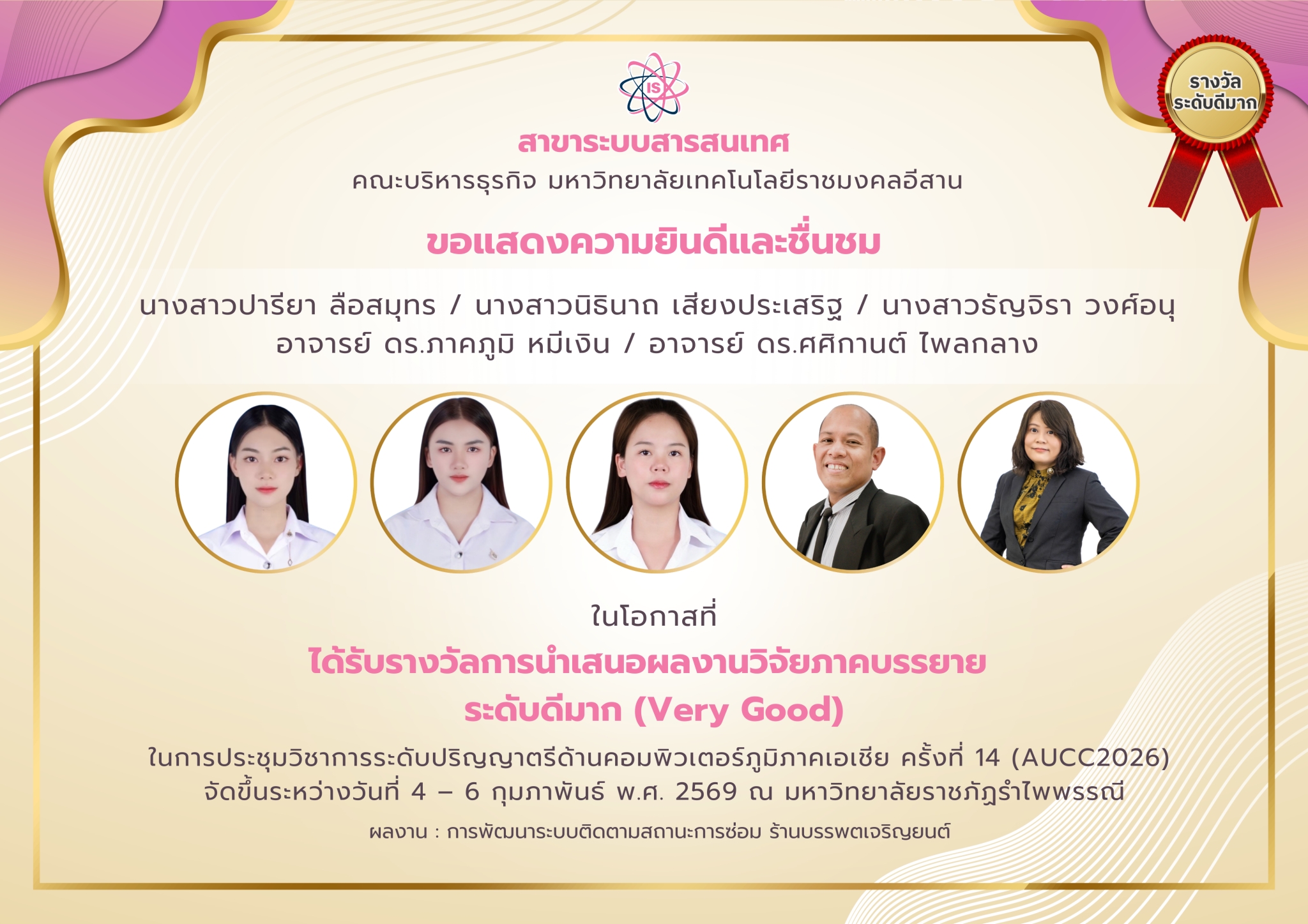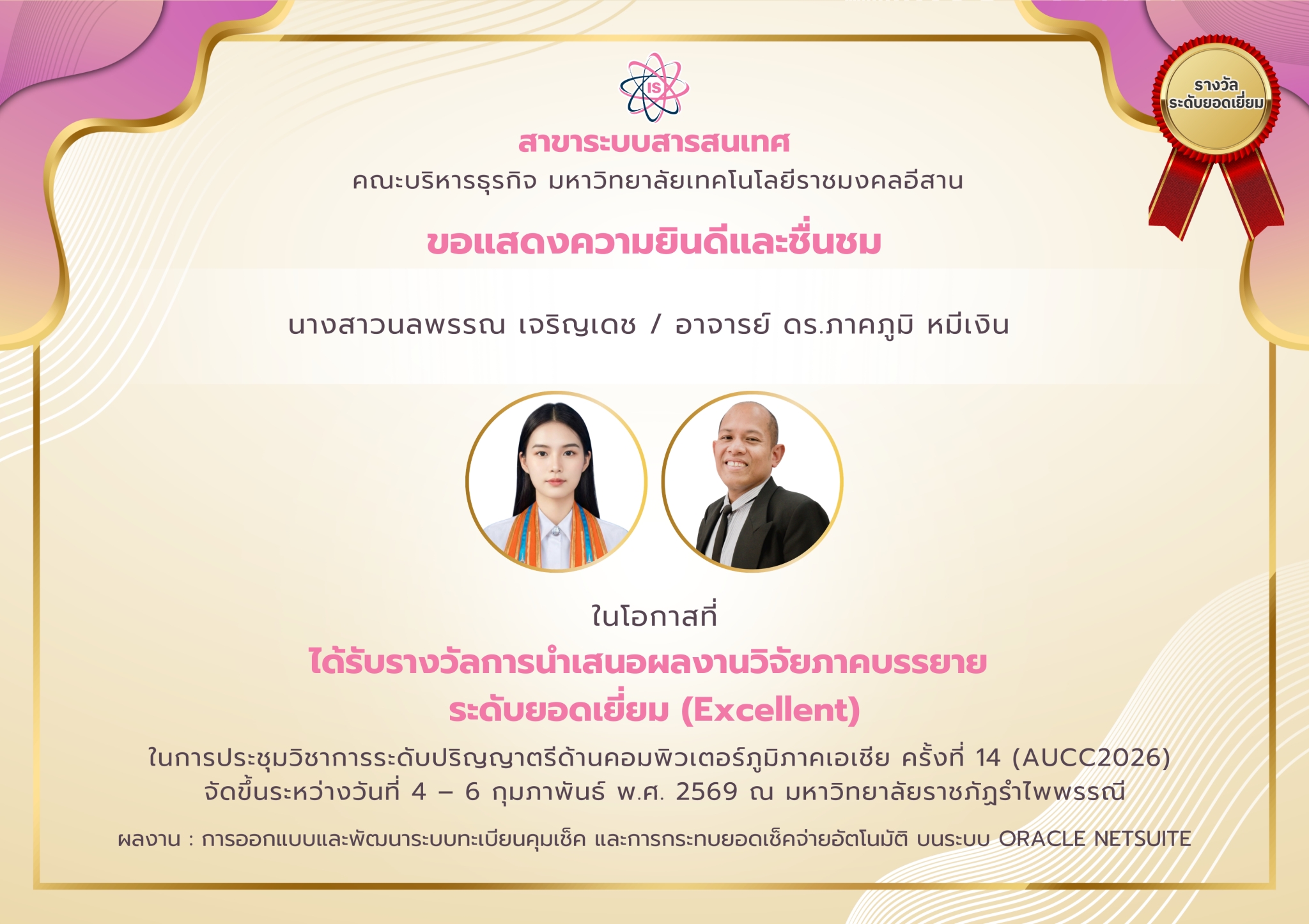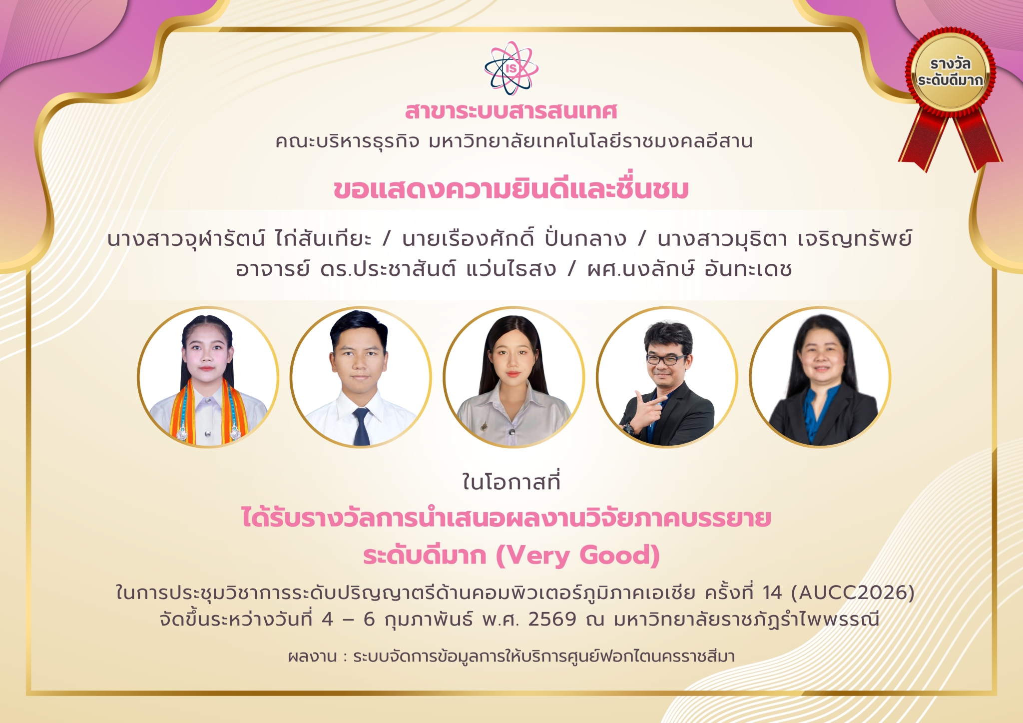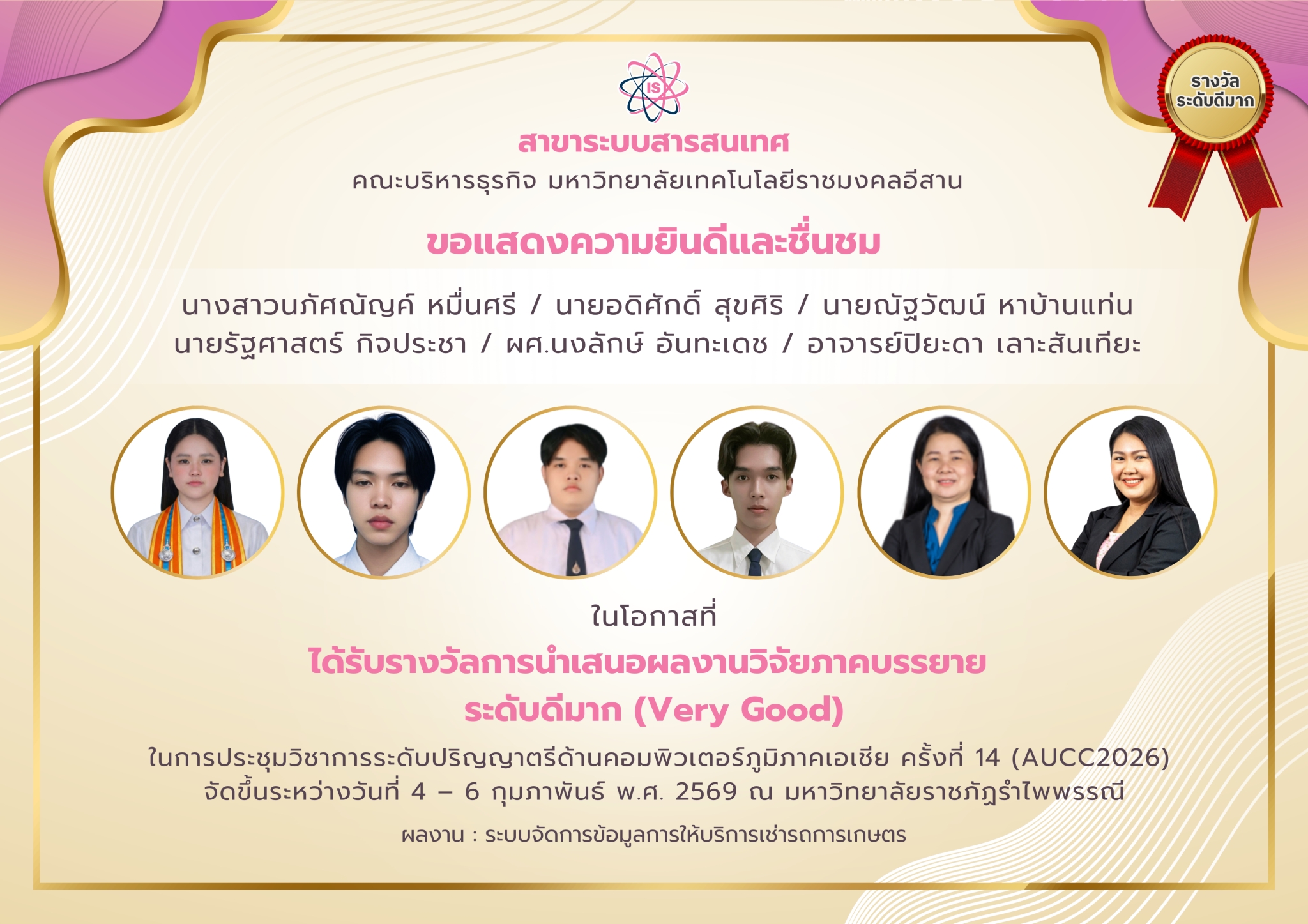 วันที่ 4 – 6 กุมภาพันธ์ 2569 สาขาระบบสารสนเทศ คณะบริหารธุรกิจ มทร.อีสาน เข้าร่วมการประชุมวิชาการระดับปริญญาตรีด้านคอมพิวเตอร์ภูมิภาคเอเชีย ครั้งที่ 14 The 14th Asia Undergraduate Conference on Computing (AUCC2026) ประจำปี 2569 ในรูปแบบออนไลน์ ณ มหาวิทยาลัยราชภัฏรำไพพรรณี จังหวัดจันทบุรี และได้ส่งผลงานในรายวิชาโครงการวิจัยระดับปริญญาตรี และโครงการสหกิจศึกษา เพื่อการนำเสนอจำนวน 29 ผลงาน และสามารถคว้ารางวัลระดับ Excellence จำนวน 2 ผลงาน รางวัลระดับ Very Good จำนวน 14 ผลงาน รางวัลระดับ Good จำนวน 11 ผลงาน และได้รับเกียรติบัตรเข้าร่วมนำเสนอ จำนวน 2 ผลงาน