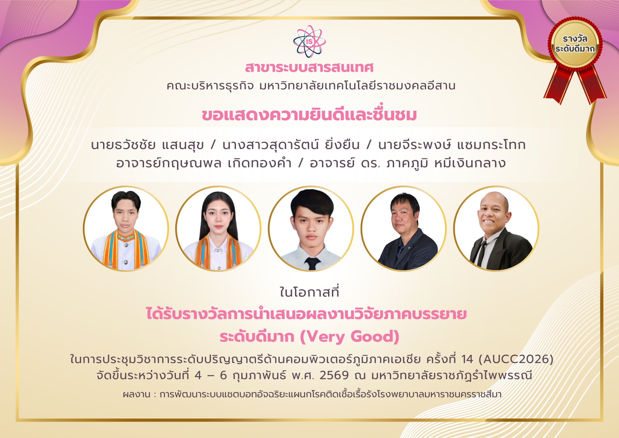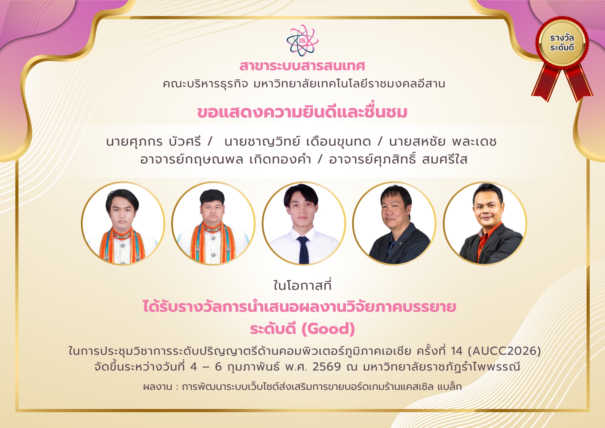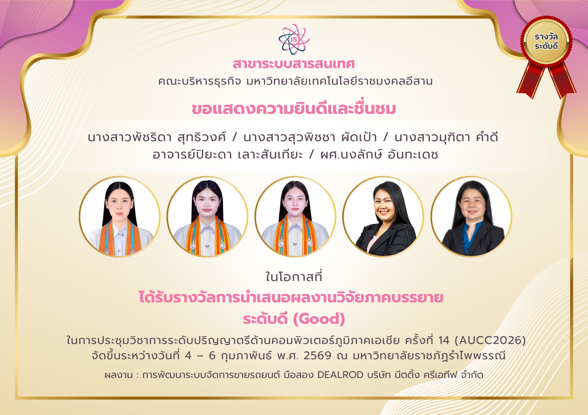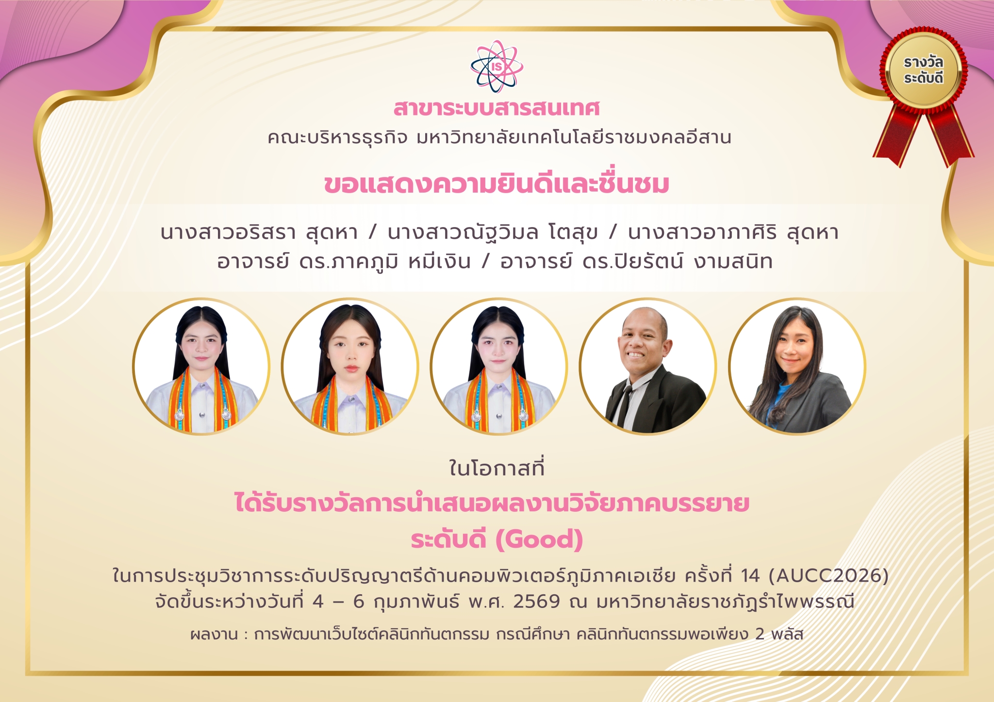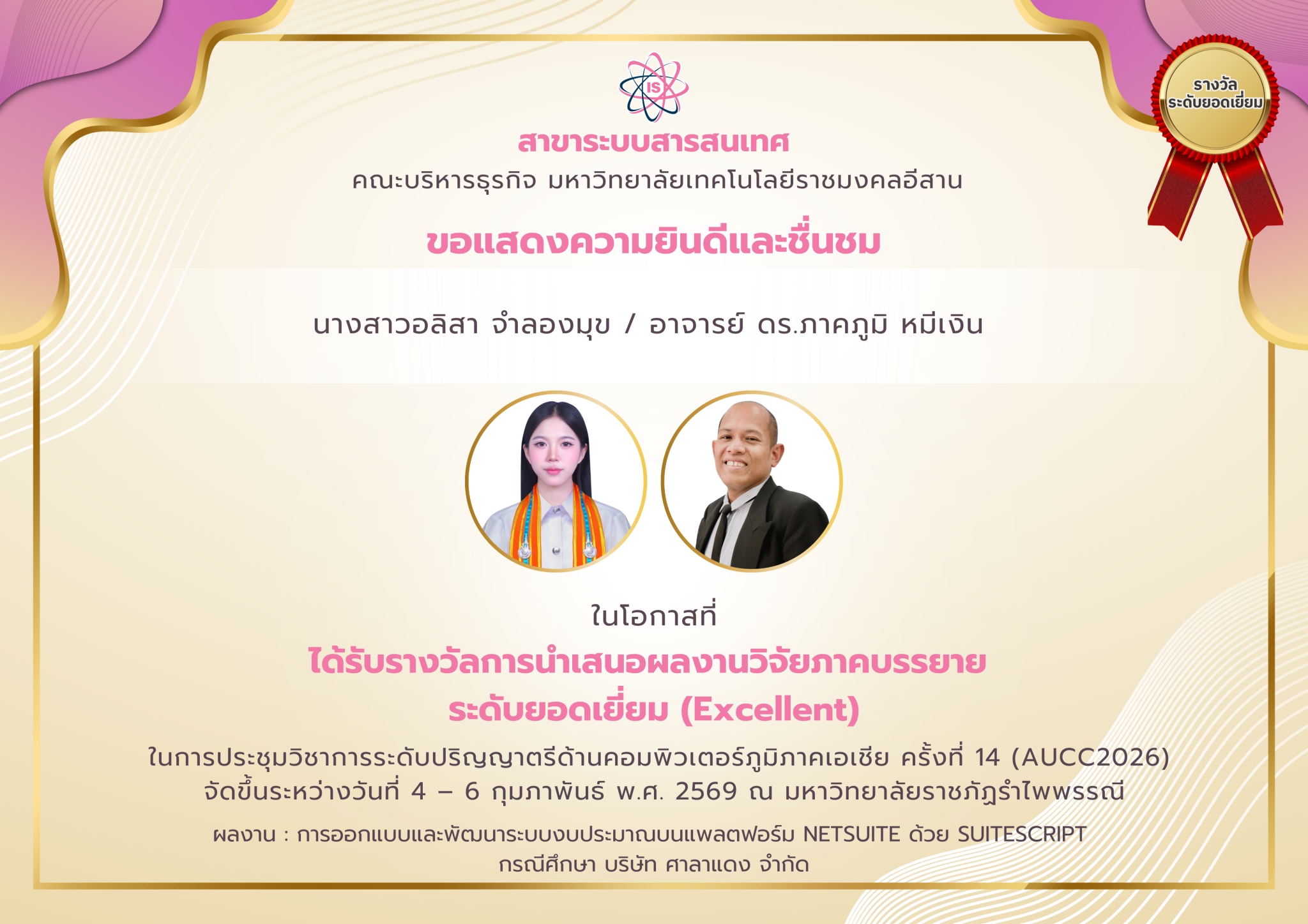 วันที่ 4 – 6 กุมภาพันธ์ 2569 สาขาระบบสารสนเทศ คณะบริหารธุรกิจ มทร.อีสาน เข้าร่วมการประชุมวิชาการระดับปริญญาตรีด้านคอมพิวเตอร์ภูมิภาคเอเชีย ครั้งที่ 14 The 14th Asia Undergraduate Conference on Computing (AUCC2026) ประจำปี 2569 ในรูปแบบออนไลน์ ณ มหาวิทยาลัยราชภัฏรำไพพรรณี จังหวัดจันทบุรี และได้ส่งผลงานในรายวิชาโครงการวิจัยระดับปริญญาตรี และโครงการสหกิจศึกษา เพื่อการนำเสนอจำนวน 29 ผลงาน และสามารถคว้ารางวัลระดับ Excellence จำนวน 2 ผลงาน รางวัลระดับ Very Good จำนวน 14 ผลงาน รางวัลระดับ Good จำนวน 11 ผลงาน และได้รับเกียรติบัตรเข้าร่วมนำเสนอ จำนวน 2 ผลงาน