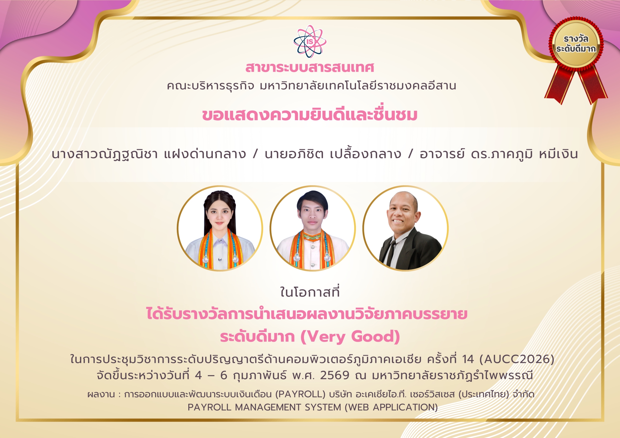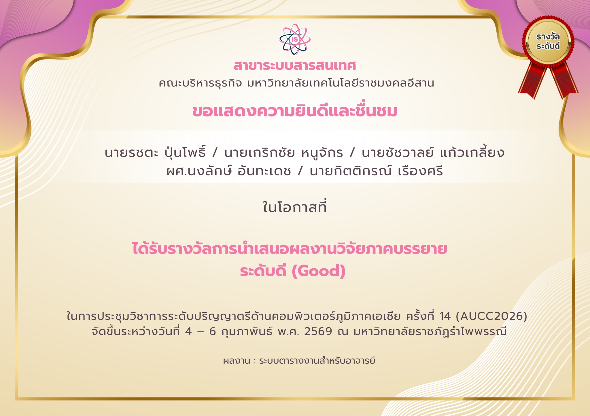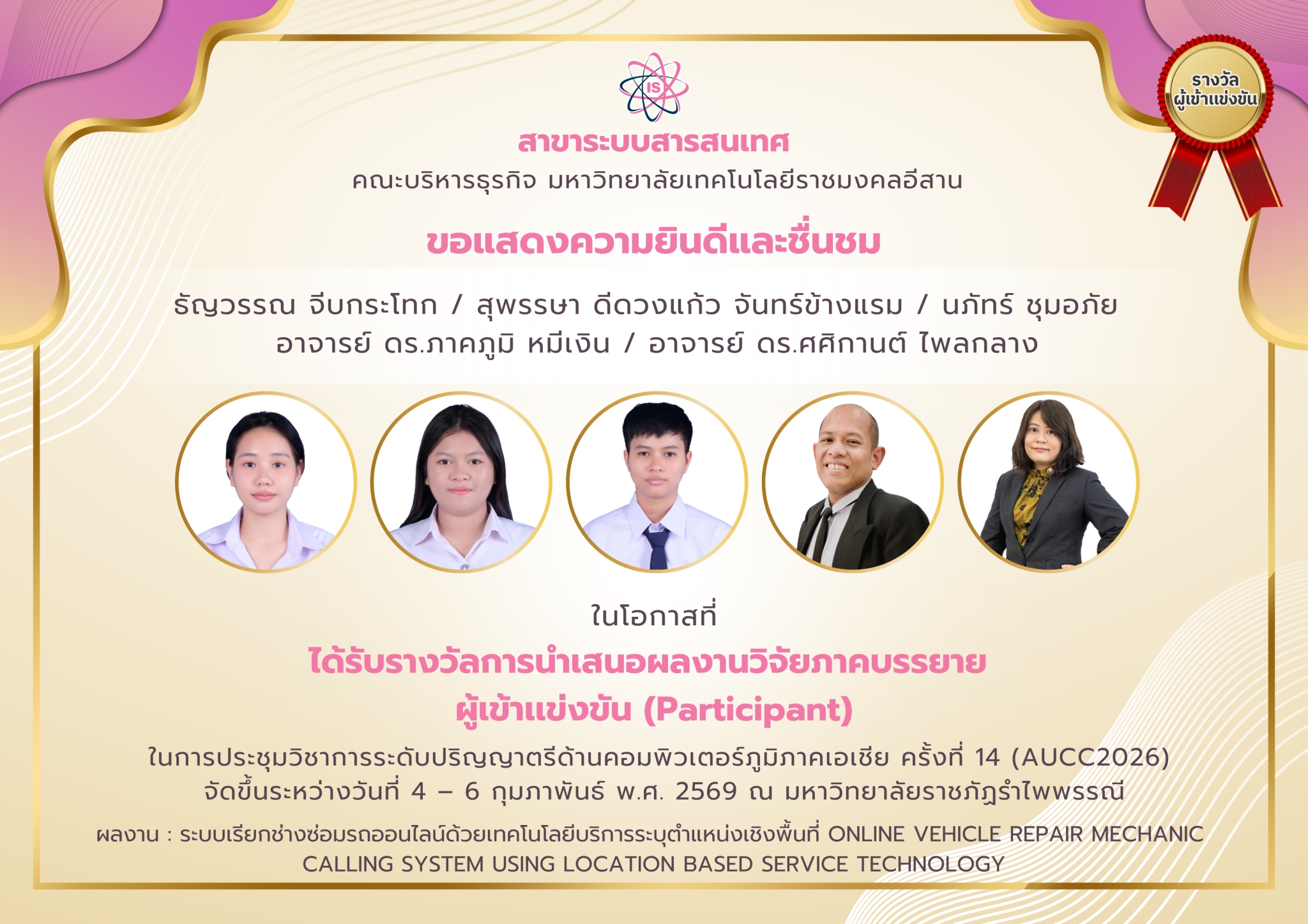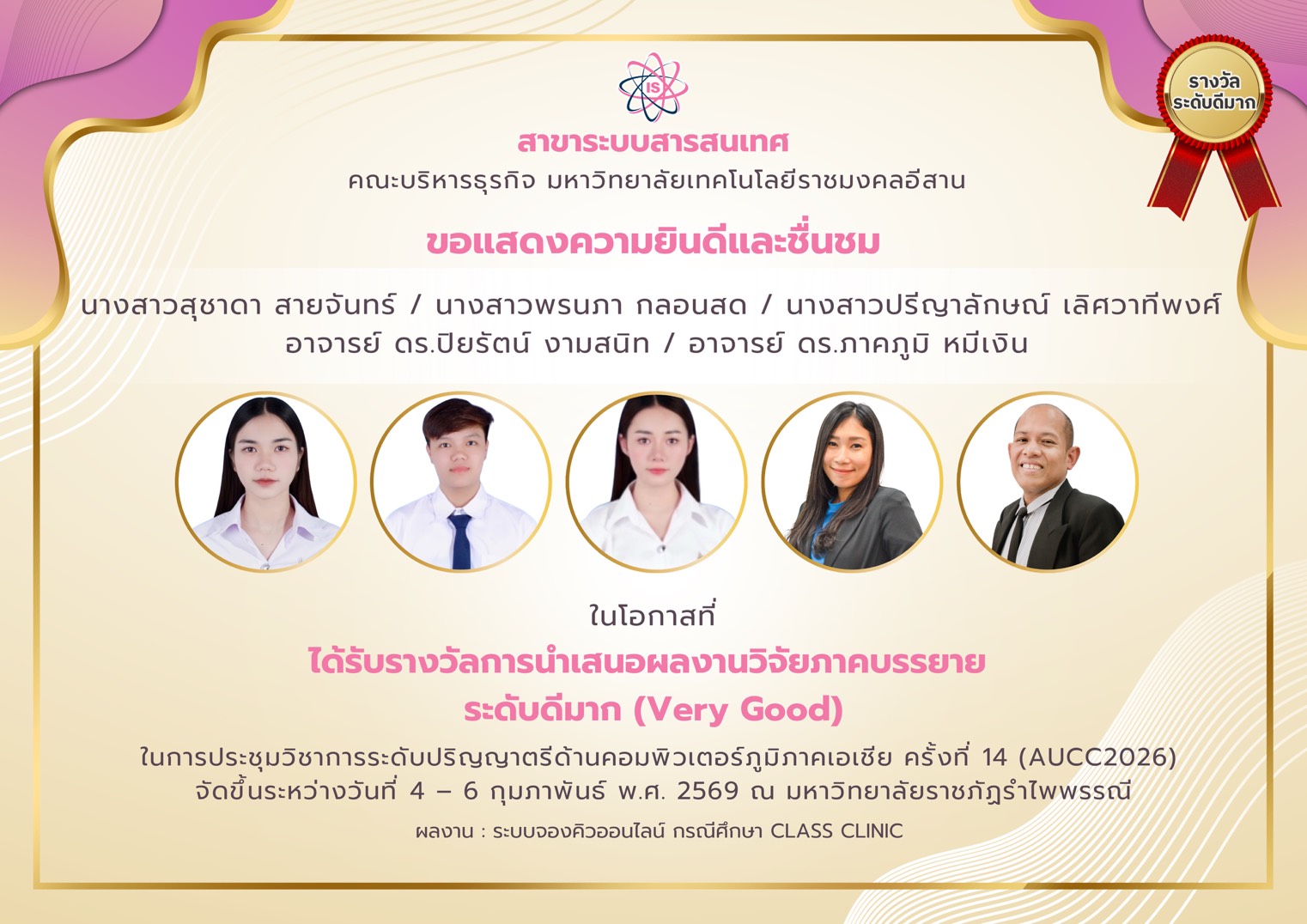 วันที่ 4 – 6 กุมภาพันธ์ 2569 สาขาระบบสารสนเทศ คณะบริหารธุรกิจ มทร.อีสาน เข้าร่วมการประชุมวิชาการระดับปริญญาตรีด้านคอมพิวเตอร์ภูมิภาคเอเชีย ครั้งที่ 14 The 14th Asia Undergraduate Conference on Computing (AUCC2026) ประจำปี 2569 ในรูปแบบออนไลน์ ณ มหาวิทยาลัยราชภัฏรำไพพรรณี จังหวัดจันทบุรี และได้ส่งผลงานในรายวิชาโครงการวิจัยระดับปริญญาตรี และโครงการสหกิจศึกษา เพื่อการนำเสนอจำนวน 29 ผลงาน และสามารถคว้ารางวัลระดับ Excellence จำนวน 2 ผลงาน รางวัลระดับ Very Good จำนวน 14 ผลงาน รางวัลระดับ Good จำนวน 11 ผลงาน และได้รับเกียรติบัตรเข้าร่วมนำเสนอ จำนวน 2 ผลงาน