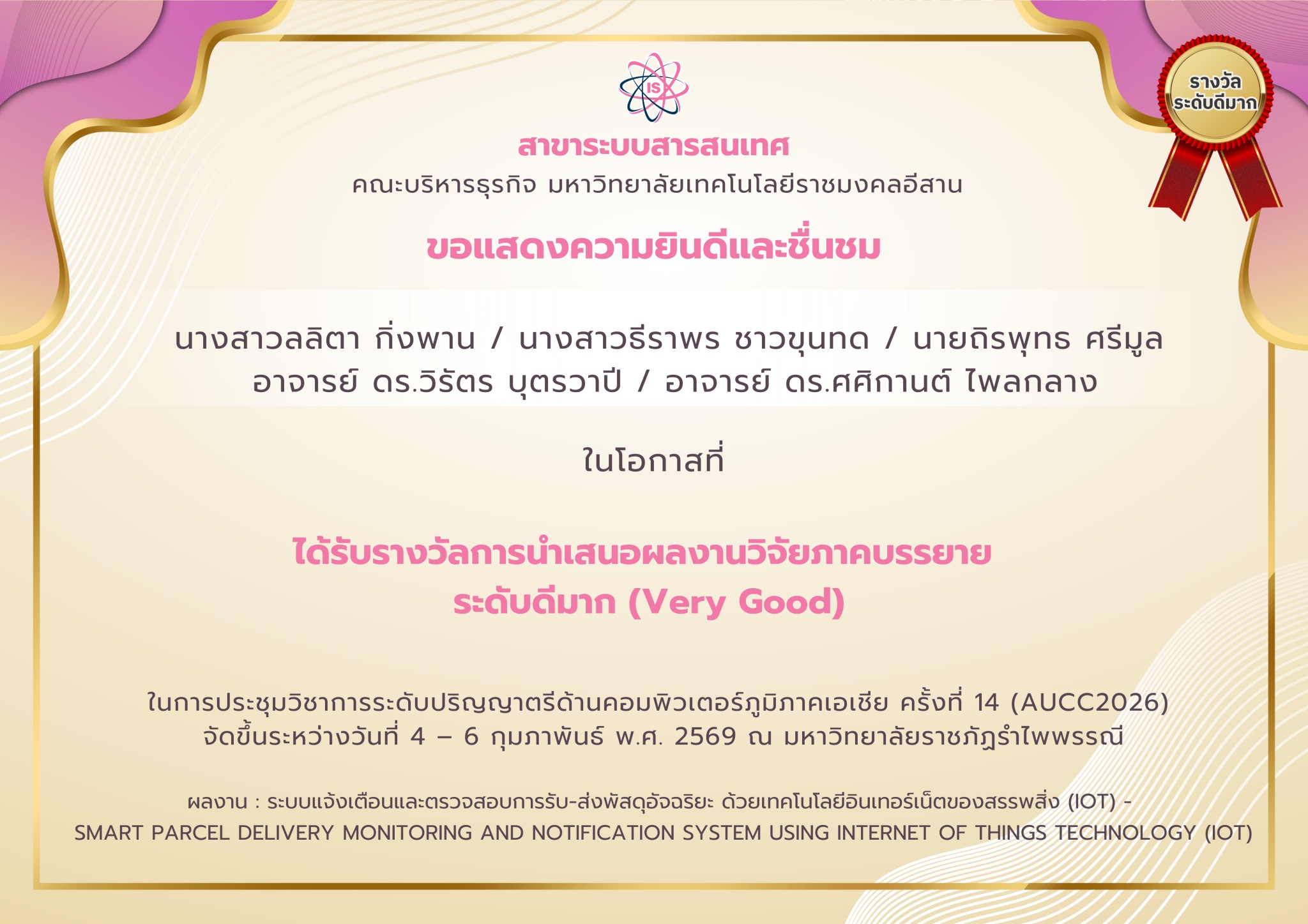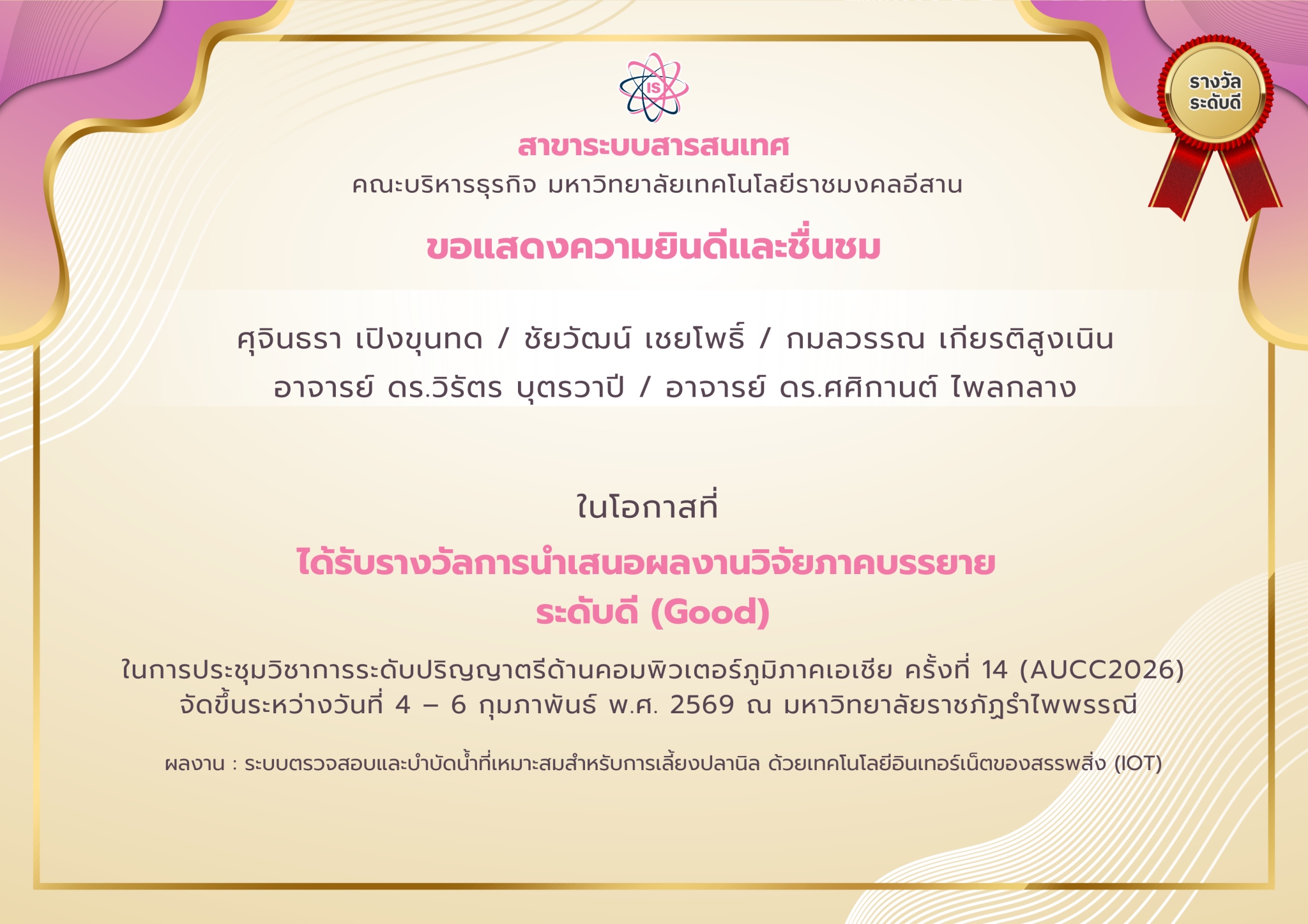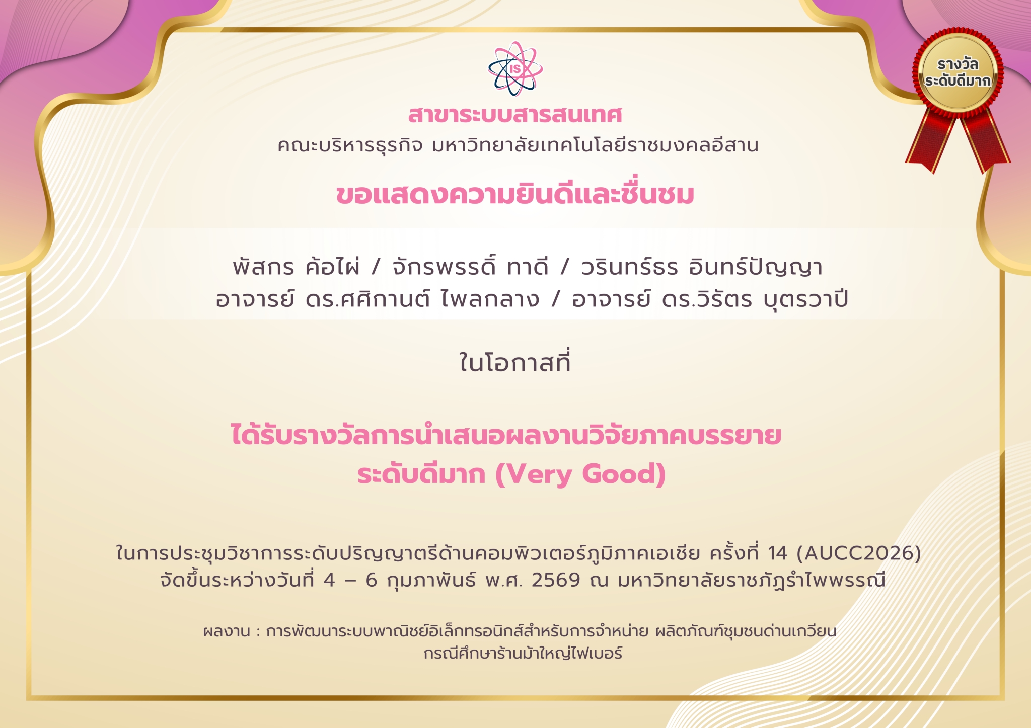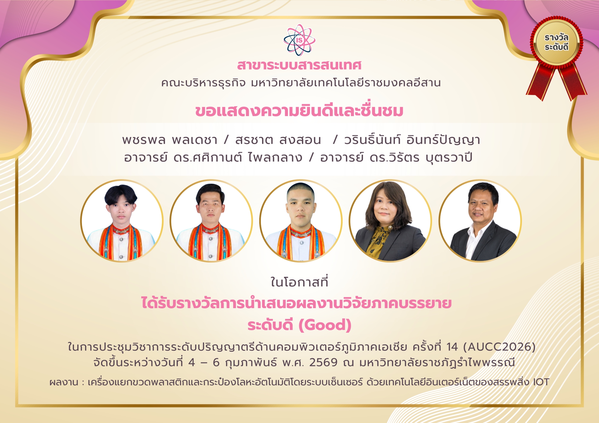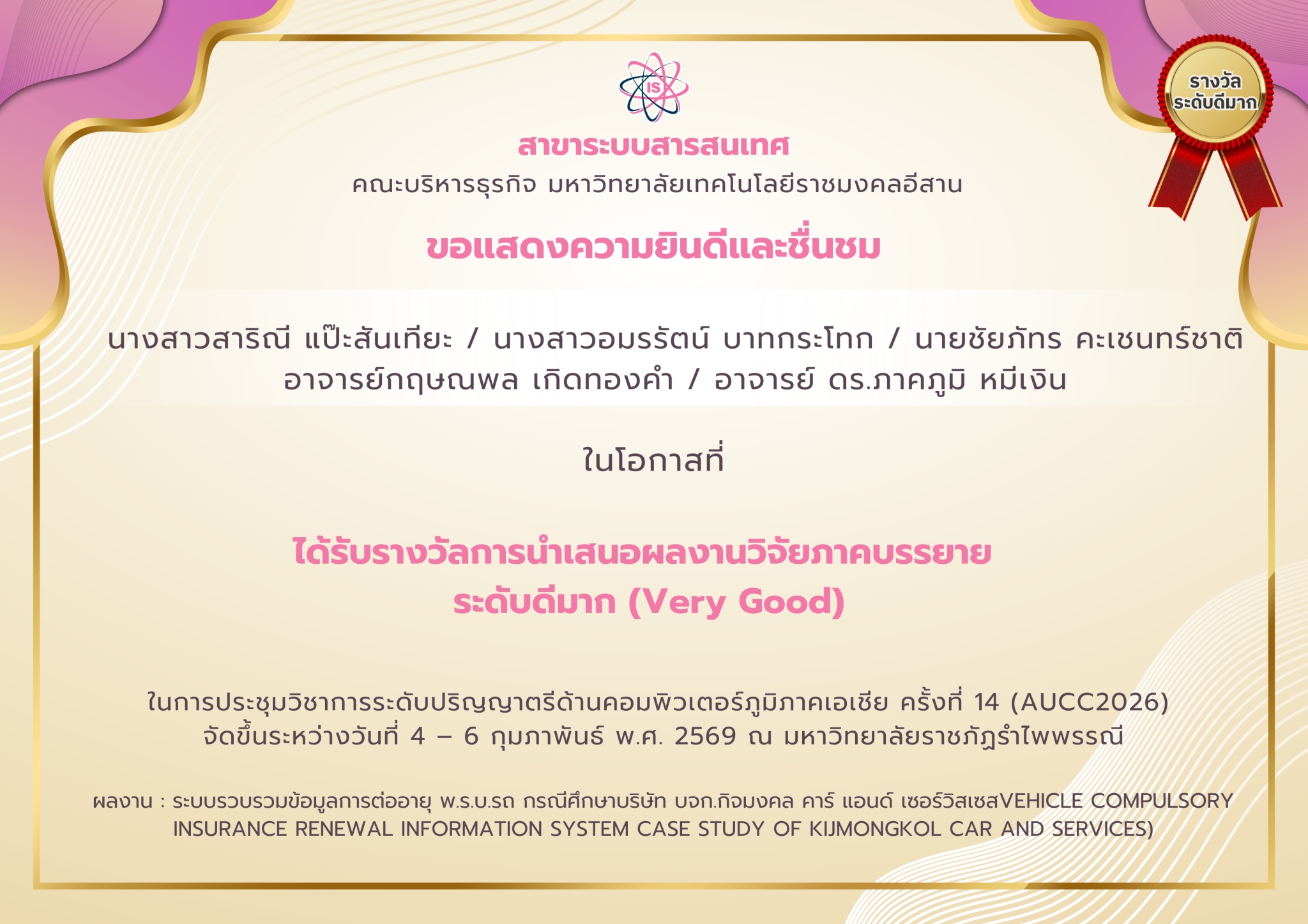 วันที่ 4 – 6 กุมภาพันธ์ 2569 สาขาระบบสารสนเทศ คณะบริหารธุรกิจ มทร.อีสาน เข้าร่วมการประชุมวิชาการระดับปริญญาตรีด้านคอมพิวเตอร์ภูมิภาคเอเชีย ครั้งที่ 14 The 14th Asia Undergraduate Conference on Computing (AUCC2026) ประจำปี 2569 ในรูปแบบออนไลน์ ณ มหาวิทยาลัยราชภัฏรำไพพรรณี จังหวัดจันทบุรี และได้ส่งผลงานในรายวิชาโครงการวิจัยระดับปริญญาตรี และโครงการสหกิจศึกษา เพื่อการนำเสนอจำนวน 29 ผลงาน และสามารถคว้ารางวัลระดับ Excellence จำนวน 2 ผลงาน รางวัลระดับ Very Good จำนวน 14 ผลงาน รางวัลระดับ Good จำนวน 11 ผลงาน และได้รับเกียรติบัตรเข้าร่วมนำเสนอ จำนวน 2 ผลงาน